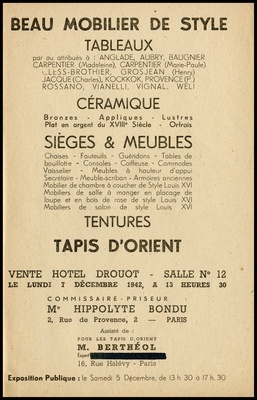 Beau mobilier de style : tableaux : par ou attribués à: Anglade, Aubry, Baugnier [und weitere] : céramique : bronzes, appliques, lustres, plat en argent du XVIIIe siècle, orfois : sièges & meubles : chaises, fauteuils, guéridons, tables de bouillotte, consoles, coiffeuse, commodes [und weiteres] : tentures : tapis d'Orient : vente Hôtel Drouot, Salle No 12 le lundi 7 décembre 1942 / commissaire-priseur: Hippolyte Bondu ; assisté de: Pour les tapis d'Orient de: M. Berthéol, expert