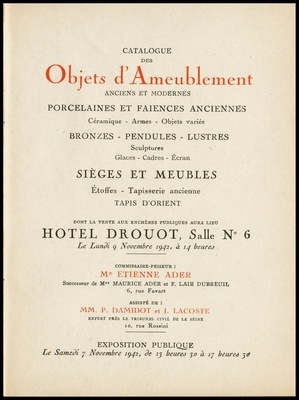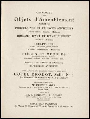 Catalogue des objets d'ameublement : anciens : porcelaines et faïences anciennes : objets variés, ivoires, reliures : bronzes d'art et d'ameublement : pendules, lustres : sculptures en bois, terre cuite, pierre, marbre : cadres, baromètres, paravent : sièges et meubles : estampillés des Maîtres ébénistes: Guignard, Lardin, Magnien, Mondon - etc. : étoffes, tapis d'Orient et d'Aubusson : tapisseries anciennes : dont la vente aux enchères publiques aura lieu Hôtel Drouot, Salle No 1 le mercredi 21 octobre 1942 / commissaire-priseur: Étienne Ader, successeur de Maurice Ader et F. Lair Dubreuil ; assisté de: P. Damidot et J. Lacoste, expert près le Tribunal civil de la Seine