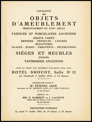 Catalogue des objets d'ameublement : principalement du XVIIIe siècle : faïences et porcelaines anciennes : objets variés, bronzes, pendules, lustres, sculptures, glaces, écran, paravents, décorations : sièges et meubles : étoffes : tapisseries ancinennes : dont la vente aux enchères publiques aura lieu Hôtel Drouot, Salle No 12 le vendredi 2 juillet 1943 / commissaire-priseur: Étienne Ader, successeur de Maurice Ader et F. Lair Dubreuil ; assisté de: P. Damidot et J. Lacoste, expert près le Tribunal civil de la Seine