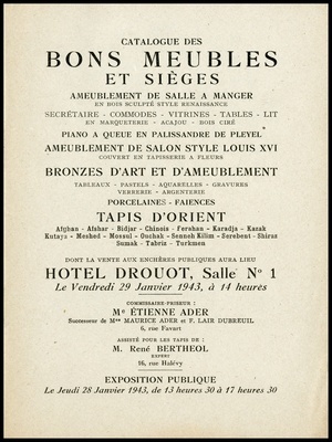 Catalogue des bons meubles et sièges : ameublement de salle à manger en bois sculpté style Renaissance : secrétaire, commodes, vitrines, tables, lit en marqueterie, acajou, bois ciré : piano à queue en palissandre de Pleyel : ameublement de salon style Louis XVI : couvert en tapisserie à fleus : bronzes d'art et d'ameublement : tableaux, pastels, aquarelles, gravures, verrerie, argenterie : porcelaines, faïences : tapis d'Orient : Afghan, Afshar, Bidjar, Chinois, Ferahan, Karadja, Kazak, Kutaya, Meshed, Mossul, Ouchak, Senneh Kilim, Serebent, Shiraz, Sumak, Tabriz, Turkmen : dont la vente aux enchères publiques aura lieu Hôtel Drouot, Salle No 1 le vendredi 29 janvier 1943 / commissaire-priseur: Étienne Ader, successeur de Maurice Ader et F. Lair Dubreuil ; assisté pour les tapis de: René Berthéol, expert