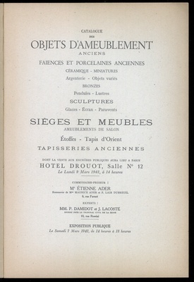 Catalogue des objets d'ameublement anciens : faïences et porcelaines anciennes : céramique, miniatures : argenterie, objets variés : bronzes : pendules, lustres : sculptures : glaces, écran, paravents : sièges et meubles : ameublement de Salon : étoffes, tapis d'Orient : tapisseries anciennes : dont la vente aux enchères publiques aura lieu à Paris, Hôtel Drouot, Salle No 12 le lundi 9 mars 1942 / commissaire-priseur: Étienne Ader, successeur de Maurice Ader et F. Lair Dubreuil ; experts: P. Damidot et J. Lacoste, experts près le Tribunal civil de la Seine
