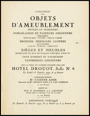 Catalogue des objets d'ameublement : anciens et modernes : porcelaines et faïences anciennes : céramique : miniatures, boîtes, objets variés : bronzes, pendules, lustres : sculptures, glaces, écrans, paravent : sièges et meubles : secrétaire en bois de placage d'époque Louis XV : tapis d'Orient et d'Aubusson, tapisseries anciennes : dont la vente aux enchères publiques aura lieu Hôtel Drouot, Salle No 6 le lundi 18 janvier 1943 / commissaire-priseur: Étienne Ader, successeur de Maurice Ader et F. Lair Dubreuil ; assisté de: P. Damidot et J. Lacoste, expert près le Tribunal civil de la Seine