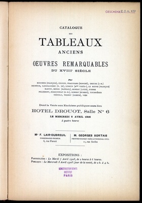 Catalogue des tableaux anciens : œuvres remarquables du XVIIIe siècle : par Boucher (François), Colson, Fragonard (Honoré), Greuze (J.-B.) [und weiteren] : dont la vente aux enchères publiques aura lieu Hôtel Drouot, Salle No 6, le mercredi 8 avril 1908 / F. Lair Dubreuil, commissaire-priseur ; Georges Sortais, peintre-expert près le tribunual civil