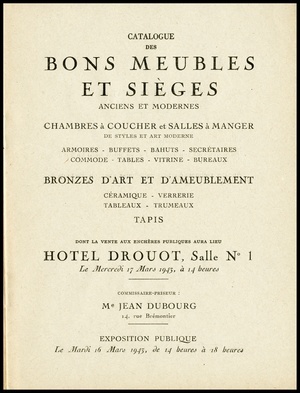 Catalogue des bons meubles et sièges : anciens et modernes : chambres à coucher et salles à manger : de styles et art Moderne : armoires, buffets, bahuts, secrétaires, commode, tables, vitrine, bureaux : bronzes d'art et d'ameublement : céramique, verrerie, tableaux, trumeaux : tapis : dont la vente aux enchères publiques aura lieu Hôtel Drouot, Salle No 1 le mercredi 17 mars 1943 / commissaire-priseur: Jean Dubourg