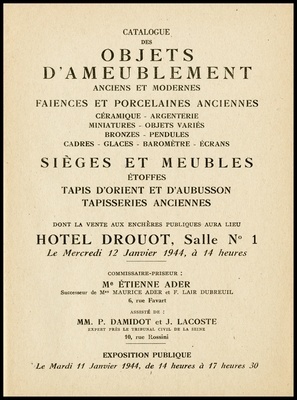 Catalogue des objets d'ameublement : anciens et modernes : faïences et porcelaines anciennes : céramique, argenterie, miniatures, objets variés, bronzes, pendules, cadres, glaces, baromètre, écrans : sièges et meubles : étoffes : tapis d'Orient et d'Aubusson : tapisseries ancinennes : dont la vente aux enchères publiques aura lieu Hôtel Drouot, Salle No 1 le mercredi 12 janvier 1944 / commissaire-priseur: Étienne Ader, successeur de Maurice Ader et F. Lair Dubreuil ; assisté de: P. Damidot et J. Lacoste, expert près le Tribunal civil de la Seine