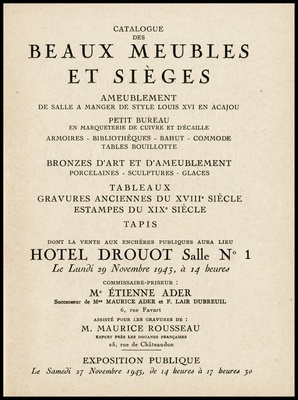 Catalogue des beaux meubles et sièges : ameublement : de salle à manger de style Louis XVI en acajou : petit bureau en marqueterie de cuivre et d'écaille : armoires, bliothèques, bahut, commode, tables bouillotte : bronzes d'art et d'ameublement : porcelaines, sculptures, glaces : tableaux : gravures anciennes du XVIIIe siècle, estampes du XIXe siècle : tapis : dont la vente aux enchères publiques aura lieu Hôtel Drouot, Salle No 1 le lundi 29 novembre 1943 / commissaire-priseur: Étienne Ader, successeur de Maurice Ader et F. Lair Dubreuil ; assisté pour les gravures de: Maurice Rousseau, expert près les douanes françaises