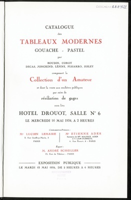 Catalogue des tableaux modernes : gouache, pastel : par Boudin, Corot, Degas, Jongkind, Lépine, Pissarro, Sisley : composant la Collection d'un amateur : et dont la vente aux enchères publiques par suite de résiliation de gages aura lieu Hôtel Drouot, Salle No 6, le mercredi 16 mai 1934 / commissaires-priseurs: Lucien Lemaire, Étienne Ader, suc. de F. Lair Dubreuil ; expert André Schœller