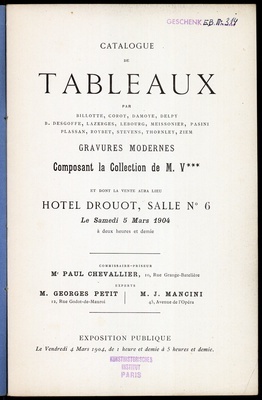 Catalogue de tableaux : par Billotte, Corot, Damoye, Delpy [und weiteren] : gravures modernes : composant la Collection de M. V*** : et dont la vente aura lieu Hôtel Drouot, Salle No 6, le samedi 5 mars 1904 / commissaire-priseur Paul Chevallier, experts Georges Petit, J. Mancini