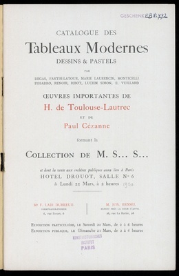Catalogue des tableaux modernes : dessins & pastels : par Degas, Fantin-Latour, Marie Laurencin, Monticelli [und weiteren] : œuvres importantes de H. de Toulouse-Lautrec et de Paul Cézanne : formant la Collection de M. S... S... : et dont la vente aux enchères publiques aura lieu à Paris, Hôtel Drouot, Salle No 6, le lundi 22 mars / F. Lair Dubreuil, commissaire-priseur ; Jos. Hessel, expert près la Cour d'Appel