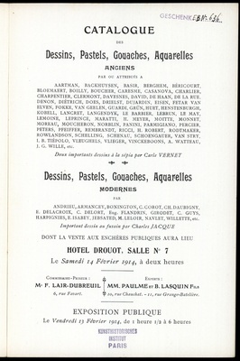 Catalogue des dessins, pastels, gouaches, aquarelles anciens : par ou attribués à Aartman, Backhuysen, Basir, Berghem, Béricourt [und weiteren] : deux importants dessins à la sépia par Carle Vernet : dessins, pastels, gouaches, aquarelles modernes : par Andrieu, Armancey, Bonington, C. Corot, Ch. Daubigny [und weiteren] : important dessin au fusain par Charles Jacque : dont la vente aux enchères publiques aura lieu Hôtel Drouot, Salle No 7, le samedi 14 février 1914 / commissaire-priseur: F. Lair Dubreuil ; experts: M. Paulme et B. Lasquin Fils