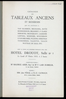 Catalogue des tableaux anciens et modernes : par ou attribués à: van Bloemen, Brueghel, Both [und weiteren] : dont la vente aux enchères publiques aura lieu Hôtel Drouot, Salle No 1, le lundi 27 février 1933 / commissaire-priseur: Maurice Ader, succr.de F. Lair Dubreuil ; experts: Jules Féral et R.Cl. Catroux