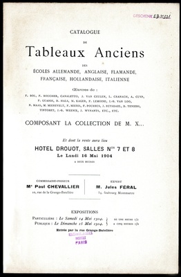 Catalogue de tableaux anciens : des Écoles allemande, anglaise, flamande, française, hollandaise, italienne : œuvres de F. Bol, F. Boucher, Canaletto, J. van Ceulen, L. Cranach, A. Cuyp [und weiteren] : composant la Collection de M. X.... : et dont la vente aura lieu Hôtel Drouot, Salles Nos 7 & 8, le lundi 16 mai 1904 / commissaire-priseur: Paul Chevallier ; expert Jules Féral