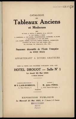 Catalogue des tableaux anciens et modernes : par de Bar, A. Belle, F. Bissolo, M.-A. Challes [und weitere] : panneaux décoratifs de l'École française du XVIIIe siècle : appartenant à divers amateurs : dont la vente aux enchères publiques aura lieu Hôtel Drouot, Salle No 1, le jeudi 24 mai 1923 / commissaire-priseur: F. Lair Dubreuil ; expert Jules Féral