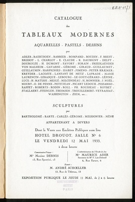 Catalogue des tableaux modernes : aquarelles, pastels, dessins : par Adler, Baertsoen, Barrier, Bompard, Boudin, F. Brest [und weiteren] : sculptures : par Bartholomé, Barye, Carlès, Gérome, Meissonier, Mène : appartenant à divers : dont la vente aux enchères publiques aura lieu Hôtel Drouot, Salle No 6, le vendredi 12 mai 1933 / commissaire-priseur: Maxime Dernis ; l'administrateur de l'étude de feu Maurice Ader, successeur de F. Lair Dubreuil ; expert André Schoeller