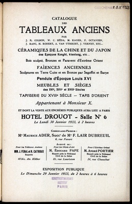 Catalogue des tableaux anciens : par J.F. Colson, W.C. Héda, M. Kager, F. Octavien [und weiteren] : céramiques de la Chine et du Japon : des époques Kanghi, Kienlong, etc... : bois sculpté, bronzes et paravent d'Extrême-Orient : faïences anciennes : sculptures en terre cuite et en bronze par Segoffin et Barye : pendule d'époque Louis XVI : meubles et sièges : des XVIe, XVIIe et XVIIIe siècles : tapisserie du XVIIIe siècle, tapis d'Orient : appartenant à Monsieur X. : et dont la vente aux enchères publiques aura lieu à Paris, Hôtel Drouot, Salle No 6, le lundi 30 janvier 1933 / commissaire-priseur: Maurice Ader, succr.de F. Lair Dubreuil ; assisté de: Pour les tableaux anciens J. Féral et R. Catroux, experts, pour les objets d'art Édouard Pape, expert près le Tribunal civil de la Seine, pour l'Extrême-Orient André Portier, expert près le Tribunal civil de la Seine