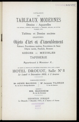 Catalogue des tableaux modernes : dessins, aquarelles : par Boudin, Corrodi, Delacroix, G. Ferrier, Helleu, de Nittis, Plassan, etc. : tableaux et dessins anciens : gravures : objets d'art et d'ameublement : faïences, porcelaines tendres, porcelaines de Saxe : objets variés, pendule, bronzes : sièges - meubles : tapisserie : appartenant à Monsieur X... : et dont la vente aux enchères publiques aura lieu à Paris, Hôtel Drouot, Salle No 8 le lundi 4 décembre 1933 / commissaires-priseurs: Henri Baudoin, Jacques Tilorier ; experts: M. Mannheim