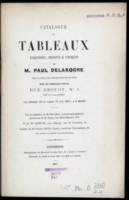 Catalogue des tableaux, esquisses, dessins & croquis de M. Paul Delaroche : vente... à Paris... Hotel Drouot, 12 et 13 Juin 1857