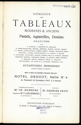 Catalogue des tableaux modernes & anciens : pastels, aquarelles, dessins : gravures par G. Anglade, L. Anquetin, H. Bellangé [und weiteren ]: sculptures modernes : d'après Caffieri et Houdon : dont la vente aux enchères publiques aura lieu Hôtel Drouot Salle No 6, le vendredi 16 novembre 1917 / commissaire-priseur Ch. Dubourg ; expert Georges Petit