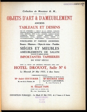 Objets d'art & d'ameublement : Collection de Monsieur G. M... : anciens tableaux et dessins : par ou attribués à: Boilly (L.-L.), Boudin, Danloux [und weitere] : porcelaines et faïences anciennes : bronzes, miniatures, objets de vitrine, pendules : sièges et meubles : ameublements de salon recouverts de tapisserie ancienne : importantes tapisseries du XVIIIe siècle : dont la vente aux enchères publiques aura lieu Hôtel Drouot, Salle No 6 le mercredi 24 mai 1933 / commissaires-priseurs: André Couturier, L'administrateur de l'étude de feu Maurice Ader, succr de F. Lair Dubreuil ; assisté de: Édouard Pape, expert près le Tribunal civil