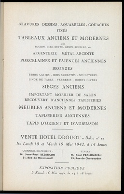 Gravures, dessins, aquarelles, gouaches : fixés : tableaux anciens et modernes : par Boudin, Diaz, Dufeu, Genin, Scheulz, etc. : argenterie, métal argenté : porcelaines et faïences anciennes : bronzes : terre cuites, bois sculptés, sculptures, linge de table, verrerie, objets divers : siéges anciens : important mobilier de Salon : recouvert d'anciennes tapisseries : meubles anciens et modernes : tapisseries anciennes : tapis d'Orient et d'Aubusson : vente Hôtel Drouot, Salle No 12 les lundi 18 et mardi 19 mai 1942 / commissaire-priseur: Jean-Paul Bezançon ; expert: Paul Prolongeau