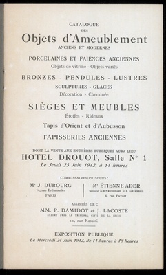 Catalogue des objets d'ameublement : anciens et modernes : porcelaines et faïences anciennes : objets de vitrine, objets variés : bronzes, pendules, lustres : sculptures, glaces : décoration, cheminée : sièges et meubles : étoffes, rideaux : tapis d'Orient et d'Aubusson : tapisseries anciennes : dont la vente aux enchères publiques aura lieu Hôtel Drouot, Salle No 1 le jeudi 25 juin 1942 / commissaires-priseurs: J. Dubourg, Étienne Ader, successeur de Maurice Ader et F. Lair Dubreuil ; assisté de: P. Damidot et J. Lacoste, expert près le Tribunal civil de la Seine