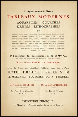 Tableaux modernes : aquarelles, gouaches, dessins, lithographies : 1e Appartenant à divers : par: Adrion, Aman Jean, Bonnard, Chagall, Colin, Coubine, Cross [und weitere] : 2e Dépendant des successions de M. et Mme P... : en vertu de jugements du Tribunal Civil du Havre : œuvres d'Othon Friesz et C. Pissarro : dont la vente aux enchères publiques aura lieu à Paris, Hôtel Drouot, Salle No 10, le mercredi 14 octobre 1942 / Me Alph. Bellier, commissaire-priseur ; André Schœller, expert