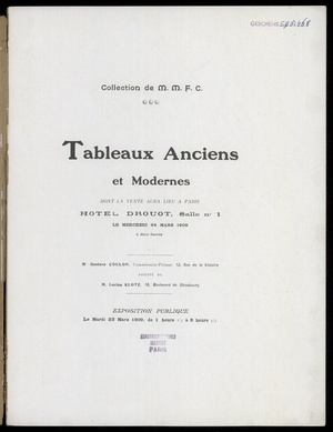 Tableaux anciens et modernes : collection de M. M. F. C. : dont la vente aux enchères publiques aura lieu à Paris, Hôtel Drouot, Salle No 1, le mercredi 24 mars 1909 / Me Gustave Coulon, commissaire-priseur ; assisté de Lucien Klotz