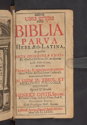 Biblia parva Hebraeo-Latina : in quibus dicta insigniora omnia ex codice Hebraeo sec. ordinem libb. biblicorum, & in his Pleraeque, & tantum non omnes voces Hebr. & Chaldaicae Codicis S. cum cura exhibentur In Usum SS. Theol. Et Sacratioris Philologiae Cultorum / Opera & Studio Henrici Opitii