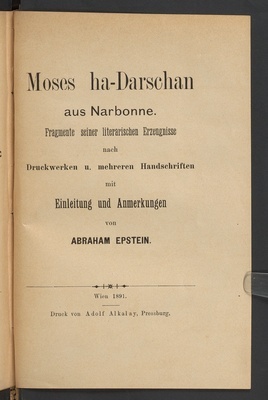 Moses ha-Darschan aus Narbonne, Fragmente seiner literarischen Erzeugnisse nach Druckwerken und mehreren Handschriften / mit Einleitung und Anmerkungen von Abraham Epstein