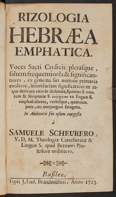 Rizologia Hebræa Emphatica : voces Sacri Codicis plerasque, saltem frequentiores & significantiores, ex genuina sua notione primaria evolvere, secundariam significationem atque derivata exinde deducere, Spiritus S. mentem & Scripturæ S. [energeias] ex linguæ S. emphasi elicere, verbisque, quantum pote, res conjugere satagens. In Auditorii sui usum congesta / a Samuele Scheurero, V. D. M. Theologiæ Catecheticæ & Linguæ S. apud Bernates Professore ordinario.