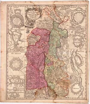 Palatinatus Rheni Tabula exquisitissima : cui quoque subjacentes ac finitimae Dominatus, Ditiones atque Satrapias fideliter inseri curavit Petrus Schenck cum Privil. Ordin. Gen. Belg. Foed. ; Sereniss. ac Potentissimo Dn. Dn. Iohanni Guilielmo D.G. Com. Palat. Rhen. S. R. I. Archithesaur. et Elect. Bavar. Jul. Cliv. ac Mont. Duc. &c. &c. Princ. ac Domino suo clementissimo hanc Palatinatus Rhen. Tabulam submisse dicat et consecrat Petrus Schenk Elbervelda Montanus / Tabulam submisse dicat et consecrat Petrus Schenk