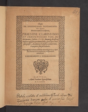 Theses De Inofficioso Testamento / Ad Quas, ... Praeside ... Hermanno Vulteio... Pro ingenij viribus publice exercitij gratia, 4. Aprilis, hora & loco consuetis, respondere conabitur Everhardvs à Gemmingen