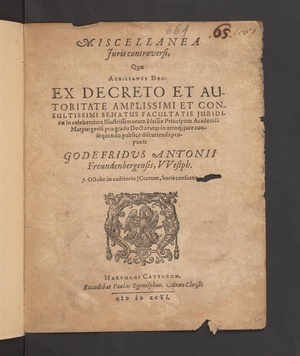 MISCELLANEA || Juris controversi,|| Quae || AUXILIANTE DEO: || EX DECRETO ET AU-||TORITATE AMPLISSIMI ET CON-||SULTISSIMI SENATUS FACULTATIS JURIDI-||cae in celeberrima Illustrissimorum Hassiae Principum Academia || Marpurgensi pro gradu Doctoratus in utroq; jure con-||sequendo publicè discutienda pro-||ponit || GODEFRIDVS ANTONII || Freundenbergensis, VVestph.|| 7. Octobr. in auditorio JCtorum, horis consuetis.||