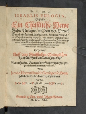 Israelis eulogia : daß ist ein christliche newe Jahr Predigte auß dem 50. Capitel Syrachs ... / von Jacobo Herrenschmidt