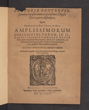 CENTURIA CONTROVERsarum propositionum ex potißima Digesti Novi parte desumpta, Quam ... IN ILLUSTRI ILLUSTRISSIMORUM HASSIAE Principum Academia Marpurgensi ... ad consequendos in utroq; Jure Titulos & honores supremos, publicè disputandam proponit, IOANNES SPRENGERUS, Susatensis VVestphalus. Ad diem 8. Augusti, in Jurisconsultorum Collegio, hora & loco consvetis