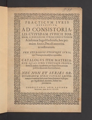 PRACTICVM IVRIS || EXERCITIVM,|| AD CONSISTORIA=||LIS CVIVSDAM IVDICII FOR-||MAM, A COLLEGIO IVRISCONSVLTORVM || Academiae Ingolstadiensis, hoc pri-||mùm Anno, Ducali autorita-||te institutum.|| PRO STVDIOSIS VTRIVSQVE IVRIS,|| cum Theoria praxim addiscere cupientibus.|| CATALOGVS ITEM MATERIA-||RVM QVAS IVRIS VTRIVSQVE PROFES-||sores in eadem Academia per sequentem annum || publicè docendo sunt tractaturi.|| NEC NON ET SERIES OR-||DINARIARVM IVRIS CIVILIS LECTIO-||num ... ||