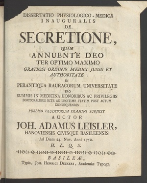 Dissertatio Physiologico-Medica Inauguralis De Secretione / Quam Annuente Deo ... In Perantiqua Rauracorum Universitate Pro Summis In Medicina Honoribus Ac Privilegiis Doctoralibus Rite Ac Legitime Statim Post Actum Consequendis Publico Eruditorum Examini Subjicit Auctor Joh. Adamus Leisler, Hanoviensis Civisque Basileensis Ad Diem 24. Nov. Anni 1752.