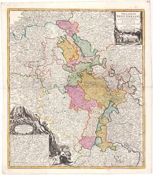 Theatrum Belli Rhenani : Auspicatis Militiae Primitiis Potentissimi Roman. Et Hunga. Regis Iosephi I. Pii Felicis Augusti Landavio Gloriose Expugnato Apertum 10 Septemb. Anno MDCCII / Novâ Tabulâ repraesentatum. â Ioan. Baptista Homan