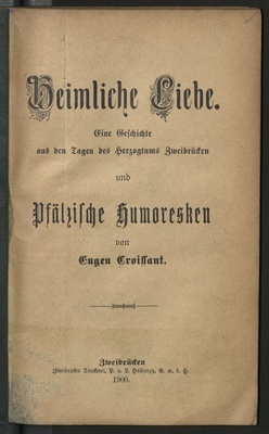 Heimliche Liebe : eine Geschichte aus den Tagen des Herzogtums Zweibrücken ; und Pfälzer Humoresken / von Eugen Croissant