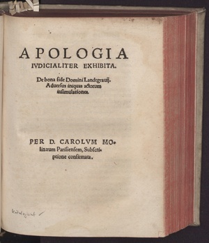 APOLOGIA || IVDICIALITER EXHIBITA.|| De bona fide Landtgrauij.|| Aduersos iniquas actorum || insimulationes.|| PER D. CAROLVM MO=||linaeum Parisiensem, Subscri=||ptione confirmata.||