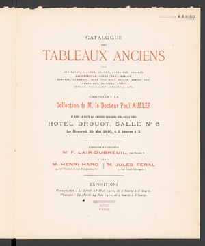 Catalogue des tableaux anciens ..., composant la collection de M. le Docteur Paul Müller et dont la vente ... aura lieu à Paris, Hôtel Drouot, le mercredi 25 mai 1910 / commissaire-priseur F. Lair-Dubreuil ...