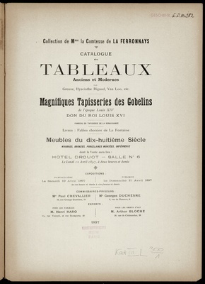 Catalogue des tableaux anciens et modernes par Greuze, Hyacinthe, Rigaud ..., magnifiques tapisseries des gobelins de l'époque Louis XIV ..., meubles du dix-huitième siècle ... : collection de Mme la comtesse de La Ferronnays ; ... la vente aura lieu Hotel Drouot le lundi 12 avril 1897 / commissaires-priseurs Paul Chevallier ...