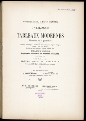 Catalogue des tableaux modernes, dessins et aquarelles ..., tableaux anciens, importante collection de bronzes de Barye, bois sculptés ... : collection de M. le baron Mourre ; dont la vente aura lieu Hotel Drouot le lundi 28 mars 1892 / G. Duchesne, commissaire-priseur ...