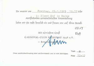 Einladung Karneval-Gesellschaft ULK Mainz-Laubenheim 1951 - Hausmaskenball Efeuhaus Laubenheim