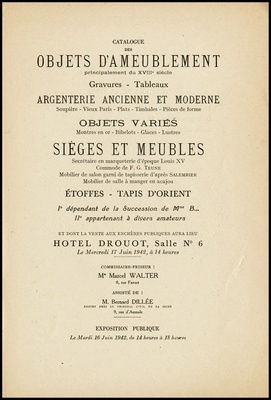 Catalogue des objets d'ameublement : principalement du XVIIIe siècle : gravures, tableaux : argenterie ancienne et moderne : soupière, vieux Paris, plats, timbales, pièces de forme : objets variés : montres en or, bibelots, glaces, lustres : sièges et meubles : secrétaire en marqueterie d'époque Louis XV : commode de F.G. Teune, mobilier de salon garni de tapisserie d'après Salembier : mobilier de salle à manger en acajou : étoffes, tapis d'Orient : I. dépendant de la succession de Mme B..., II. appartenant à divers amateurs : et dont la vente aux enchères publiques aura lieu Hôtel Drouot, Salle No 6 le mercredi 17 juin 1942 / commissaire-priseur Marcel Walter ; assisté de: Bernard Dillée, expert près le Tribunal civil de la Seine