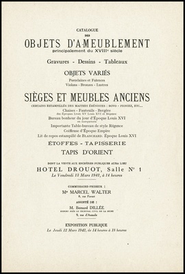 Catalogue des objets d'ameublement : principalement du XVIIIe siècle : gravures, dessins, tableaux : objets variés : porcelaines et faïences : violons, bronzes, lustres : sièges et meubles anciens : certains estampillés des Maîtres ébénistes: Bovo - Pioniez, etc... : chaises, fauteuils, bergère des époques Louis XV, Louis XVI et Régence : bureau bonheur du jour d'époque Louis XVI ... : étoffes, tapisserie : tapis d'Orient : dont la vente aux enchères publiques aura lieu à Paris, Hôtel Drouot, Salle No 1 le vendredi 13 mars 1942 / commissaire-priseur Marcel Walter ; assisté de: Bernard Dillée, expert près le Tribunal civil de la Seine