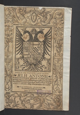 Habes In Hoc Volvmine Amice Lector. Aelii Antonii Nebrissensis Rervm A Fernando & Elisabe Hispaniaru[m] foelicissimis Regibus gestar[um] Decades duas / [Verf.: Hernando Del Pulgar]