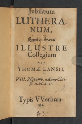 Jubilaeum Lutheranum / Quod celebravit Illustre Collegium Ore Thomae Lanisii, VIII. Novemb. Anno Christi, M.DC.XVII