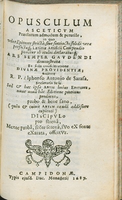 Opusculum Asceticvm Praeclarum admodum & perutile, in quo velut Epitome strictâ, siue succincto solidi verae perfectaq[ue] Laetitiae Artificii Compendio ponitur ob oculos declaraturq[ue] Ars Semper Gavdendi : demonstrata Ex sola consideratione Divinae Providentiae / Auctore R.P. Alphonso Antonio de Sarasa. Societatis Iesu