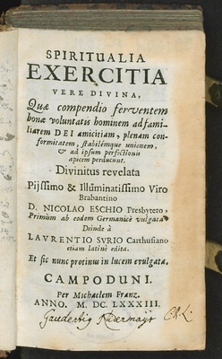 Spiritualia exercitia vere divina : quae compendio ferventem bonae voluntatis hominem ad familiarem dei amicitiam, plenam conformitatem, stabilémque unionem & ad ipsum perfectionis apicem perducunt / divinitus revelata ... D. Nicolao Eschio presbytero, primùm ab eodem germanicè vulgata. Deinde à Lavrentio Svrio Carthusiano etiam latinè edita